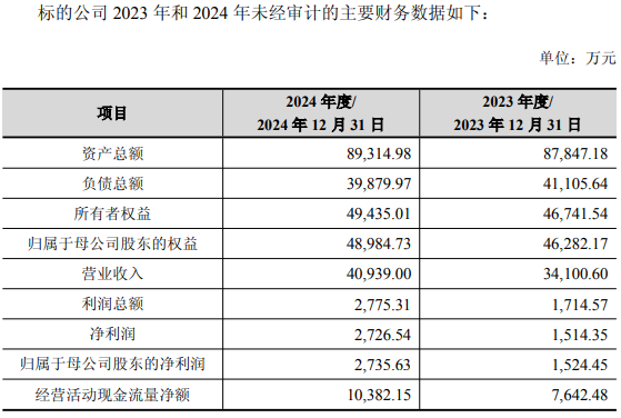 2023年、2024年,标的公司营业收入分别为34,100.60万元、40,939.00万元,净利润分别为1,514.35万元、2,726.54万元,归属于母公司股东的净利润分别为1,524.45万元、2,735.63万元,经营活动现金流量净额分别为7,642.48万元、10,382.15万元。