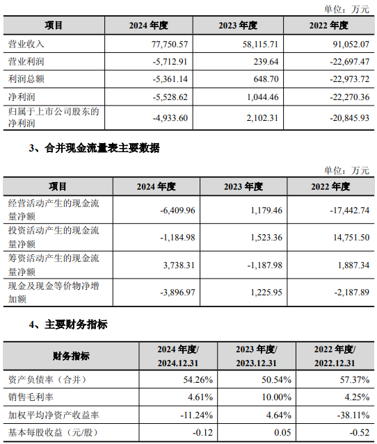 2022年、2023年、2024年,华升股份营业收入分别为91,052.07万元、58,115.71万元、77,750.57万元,净利润分别为-22,270.36万元、1,044.46万元、-5,528.62万元,归属于上市公司股东的净利润分别为-20,845.93万元、2,102.31万元、-4,933.60万元,经营活动产生的现金流量净额分别为-17,442.74万元、1,179.46万元、-6,409.96万元,资产负债率(合并)分别为57.37%、50.54%、54.26%。