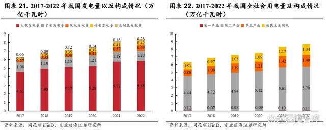从用电量来看,2017-2022 年,我国全社会用电量从 6.31 万亿千瓦时增长到 8.64 万亿千瓦时,CAGR 为 6.5%,其中主要增长动力来自第二产业。2017-2022 年,我国第二产业用电量从 4.44 万亿千瓦时增长到 5.70 万亿千瓦时,增长 1.26 万亿千瓦时。