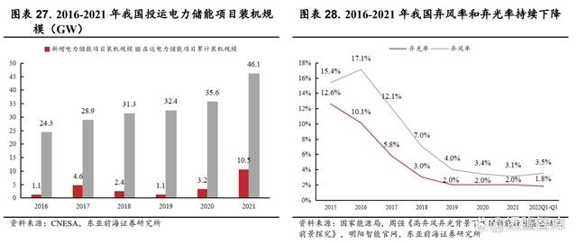 受电力储能装机规模持续增长影响,2016 到 2021 年,我国弃风率和弃光率分别从 17.1%和 10.1%下降到 3.1%和 2.0%,风电和光伏利用率大幅提升。