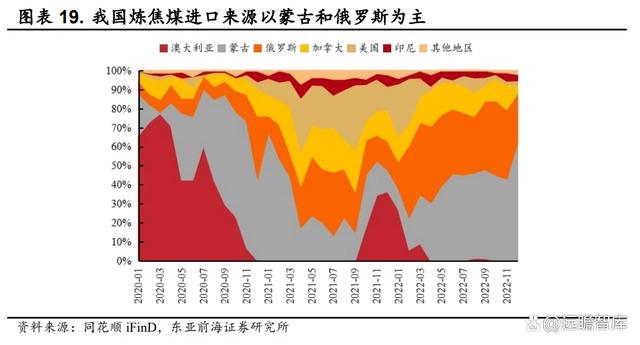 从进口来源来看,目前我国炼焦煤进口来源主要以蒙古和俄罗斯为主,2022 年分别占我国炼焦煤进口量的 40.12%和 32.90%。此前澳大利亚为主要进口来源,但是受中澳关系等因素影响,2020 年以来中国对澳煤进口采取限制,澳煤占比大幅下滑。