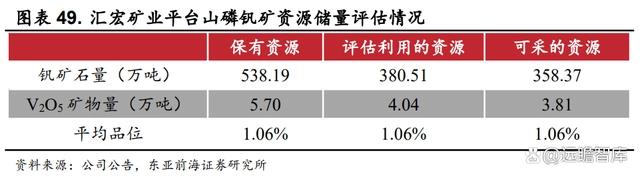 德泰储能公司收购新疆汇友集团所持的钒矿资源公司汇宏矿业 65%股权。汇宏矿业钒矿资源品位优良,平台山磷钒矿保有钒矿石量 538.19 万吨、五氧化二钒矿物量 5.70 万吨,平均品位 1.06%。经过更新和技术改造后,其拥有的钒矿石资源量可达 2,490 万吨,五氧化二钒资源量可达 24.15 万吨,五氧化二钒产能 3,000 吨/年。