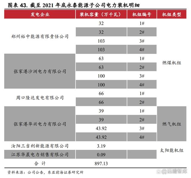 截至 2021 年底,公司控股的电力总装机容量约为 897 万千瓦,均为在运机组,其中燃煤机组装机量为 728 万千瓦,占据主导地位,是郑州、周口和张家港的重要电力供应源;燃气机组装机量为 165.84GW,主要供应张家港地区。