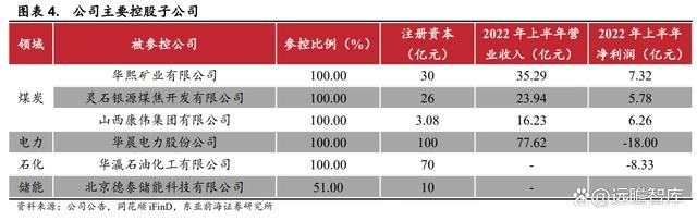 截至 2022 年半年报,公司主要子公司包括华熙矿业、银源煤焦、康伟集团、华晨电力和华瀛石化等,其中华熙矿业、银源煤焦和康伟集团主要进行煤矿投资和煤炭开采业务,华晨电力和华瀛石化分别负责电力和石化业务。