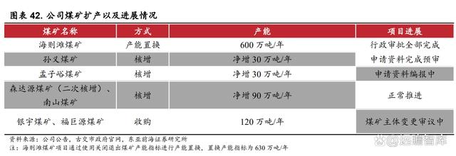 截至 2022 年 6 月底,公司煤炭总产能规模为 990 万吨/年。公司煤炭业务扩张和产业升级的主要手段包括煤矿新建、产能核增与煤矿收购。目前公司主要新建煤矿项目为海则滩煤矿项目,煤矿资源量 11.45 亿吨,煤种主要为优质动力煤及化工用煤。