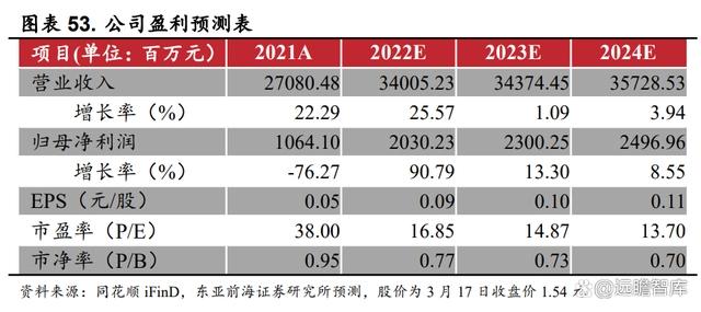 我们预期2022/2023/2024年公司归母净利润分别为20.30/23.00/24.97亿元,对应的 EPS 分别为 0.09/0.10/0.11元/股。以 2023 年 3 月 17 日收盘价 1.54 元为基准,对应 PE 分别为 1685/14.87/13.70 倍。