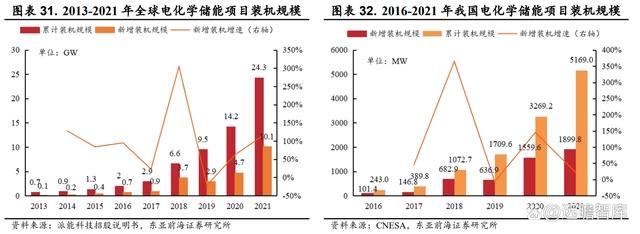 从我国来看,2016-2021 年我国电化学储能新增装机规模从 101.4MW 增长到 1899.9MW,CAGR 达 79.7%,略高于全球平均增速。