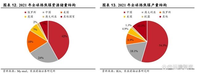 从储量来看,据 BP 《Statistical Review of World Energy 2021》,截至 2020 年底全球煤炭资源已探明储量为 10741.08 亿吨。而据 My steel 数据,全球煤炭资源中炼焦煤不足 1/10。截至 2021 年底,俄罗斯在全球炼焦煤储量中占比最高,达 42%,其次是中国,占比为24%。然而,2021年中国炼焦煤产量占全球产量的54.5%,与储量结构严重不匹配。