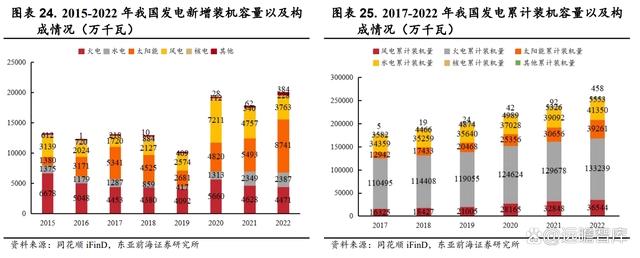 新能源占我国电力装机容量比例稳步提升。从累计装机容量来看,2017-2022年,我国发电累计装机容量从 17.77 亿千瓦增长到 25.64 亿千瓦,其中火电和水电装机容量占比分别从 62.18%和 19.33%下降至 51.96%和16.13%,新能源装机容量占比则从 18.49%提升到 31.91%,增幅为 13.42 个 pct。
