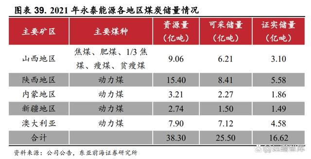 分矿区来看,公司主要矿区分布在山西、陕西、内蒙、新疆地区以及澳大利亚。陕西、内蒙、新疆地区以及澳大利亚的矿区主要为动力煤,2021 年合计资源量、可采储量和证实储量分别 29.24 亿吨、19.30 亿吨和 13.51 亿吨,其中陕西地区的动力煤资源最丰富,资源量为 15.40 亿吨,其次为澳大利亚的 7.90 亿吨。