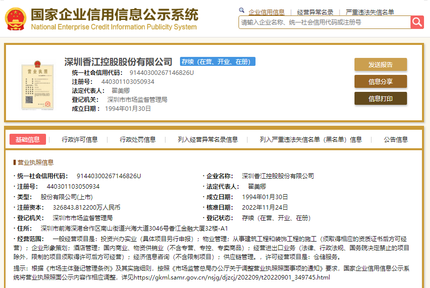 11月25日,深圳香江控股股份有限公司注册资本从“339578.1424万元人民币”减少到“326843.8122万元人民币”,共减少金额约2734.33万元。