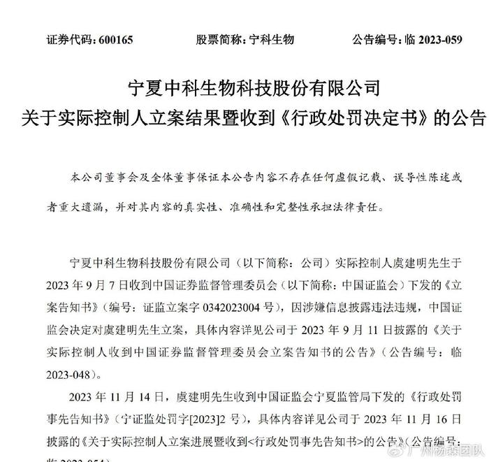 2023年11月29日,宁夏中科生物科技股份有限公司(简称公司或者宁科生物)披露,实际控制人虞建明先生于近日收到中国证监会宁夏监管局下发的《行政处罚决定书》([2023]2号)。