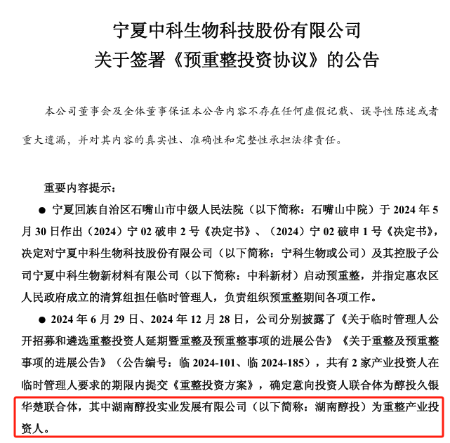 近日,宁夏中科生物科技股份有限公司(*ST宁科,600165)发布公告,宣布与湖南醇投实业发展有限公司(以下简称“湖南醇投”)及15家财务投资人签署《预重整投资协议》。