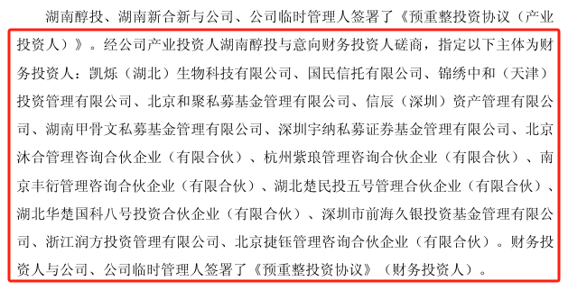 今年7月,意向投资人湖南醇投最终成为上市公司的重整产业投资人。