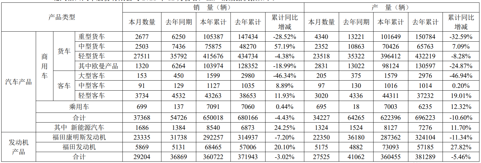 1月10日,北汽福田汽车股份有限公司(以下简称“福田汽车”)发布2021 年12月份各产品产销数据快报。福田汽车2021年12月合计销量为3.74万辆,同比下降31.72%;2021年合计销量为65万辆,同比下降4.43%。
