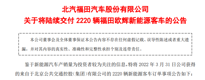 2022年3月31日,北汽福田汽车股份有限公司发布公告称,公司将于2023年6月30日前陆续向北京公共交通控股(集团)有限公司交付2220辆福田欧辉新能源纯电动、插电增程式油电混合动力及插电增程式气电混合动力客车,合同总金额为35.7亿元。