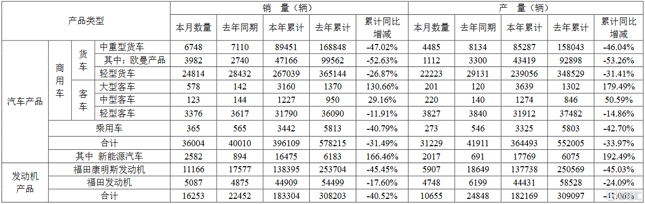格隆汇11月4日丨福田汽车(600166.SH)披露2022年10月份各产品产销数据快报,其中,本月汽车产品销量36004辆,同比下降10.01%,本年累计销量396109辆,同比下降31.49%。