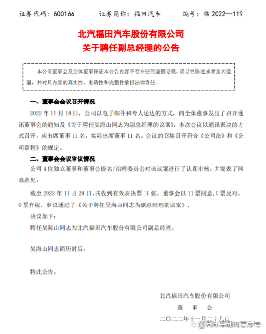 公告内容显示,11月18日,福田去以电子邮件和专人送达的方式,向全体董事发出了召开通讯董事会的通知及《关于聘任吴海山同志为副总经理的议案》,截至11月28日,共收到有效表决票11张,董事会以11票同意、0票反对、0票弃权审议通过了上述议案。