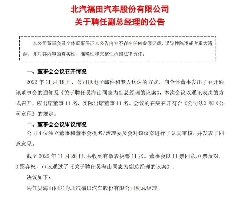 截至2022年11月28日,共收到有效表决票11张。董事会以11票同意,0票反对,0票弃权,审议通过了《关于聘任吴海山同志为副总经理的议案》,决议聘任吴海山同志为北汽福田汽车股份有限公司副总经理。