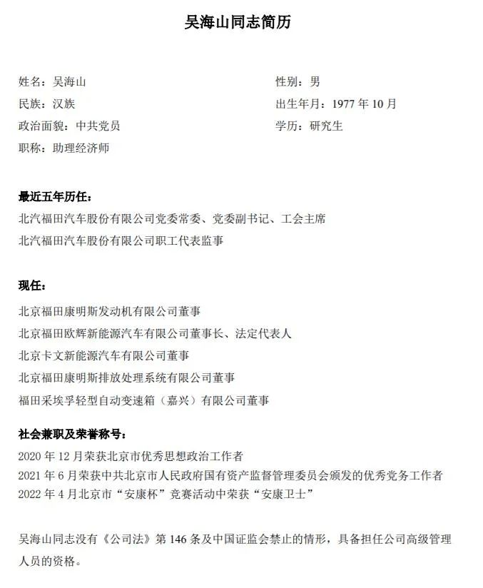 11月28日晚间,北汽福田汽车股份有限公司发布了关于聘任副总经理的公告,将聘任吴海山同志为北汽福田汽车股份有限公司副总经理。