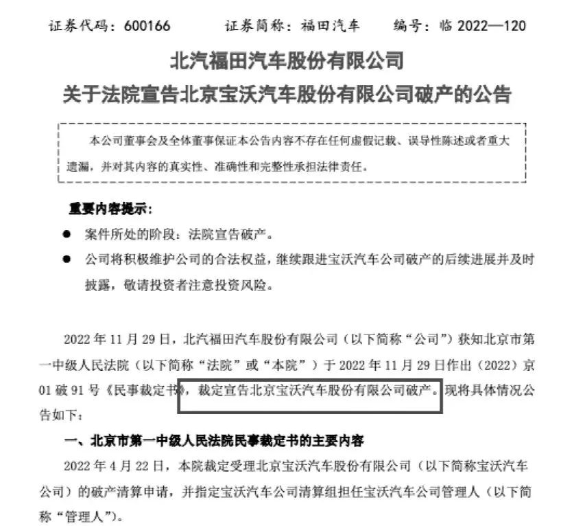 11月30日,福田汽车(600166)发布公告称,公司获知北京市第一中级人民法院作出的《民事裁定书》,裁定宣告北京宝沃汽车股份有限公司(下称“宝沃汽车”)破产。