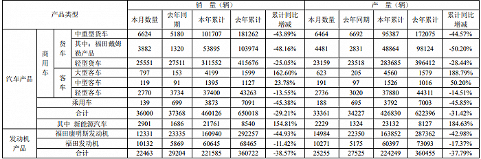 福田汽车1月9日披露2022年12月份各产品产销数据快报,2022年12月,汽车产品销量3.6万辆;2022年累计销量460126辆,同比下降29.21%。其中,新能源汽车12月销量2901辆;2022年累计销量21761辆,同比增长154.81%。