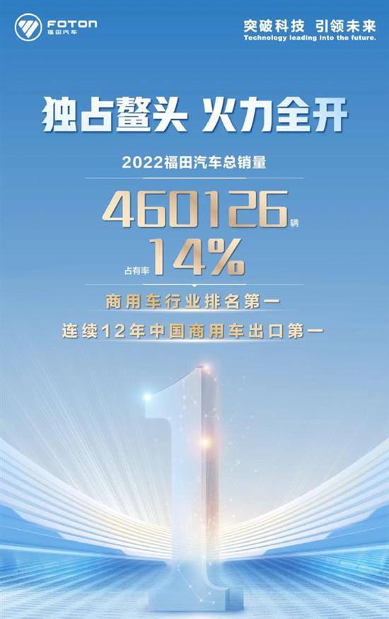 近日,福田汽车公布2022年共销售460126辆新车,同比下降29.21%,其中12月销量为3.6万辆。新能源汽车12月销量2901辆;2022年累计销量21761辆,同比增长154.81%。