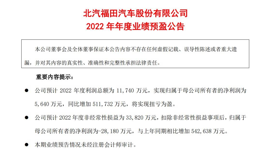 近日,福田汽车发布2022年年度业绩预盈公告。根据公告,福田汽车预计2022年度利润总额为11,740万元,实现归属于母公司所有者的净利润为5,640万元,相比上年同期亏损50.61亿元,同比增加约51.17亿元,将实现扭亏为盈。