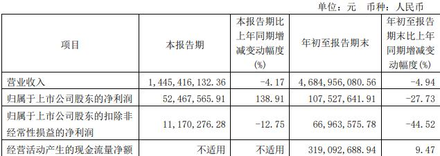 去年前三季度,公司实现营业收入46.85亿元,同比减少4.94%;实现归属于上市公司股东的净利润1.08亿元,同比减少27.73%;实现归属于上市公司股东的扣除非经常性损益的净利润6696.36万元,同比减少44.52%;经营活动产生的现金流量净额为3.19亿元。