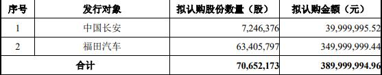 本次向特定对象发行股票的种类为境内上市人民币普通股(A股),每股面值为1.00元,向特定对象发行的股票上市地点为上交所,向特定对象发行股票数量为7065.22万股,不超过公司发行前总股本的30%,并以中国证监会同意注册的股票数量为准。其中,中国长安拟认购股票数量为724.64万股;福田汽车拟认购股票数量为6340.58万股。