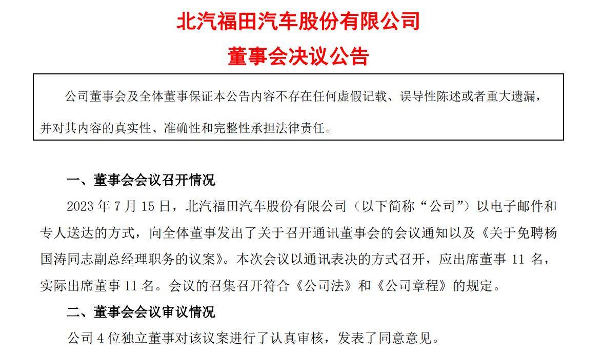 公告显示,2023年7月15日,福田汽车以电子邮件和专人送达的方式,向全体董事发出了关于召开通讯董事会的会议通知以及《关于免聘杨国涛同志副总经理职务的议案》。截至 2023年7月24日,福田汽车董事会共收到有效表决票11张,一致同意免聘杨国涛的福田汽车副总经理职务。