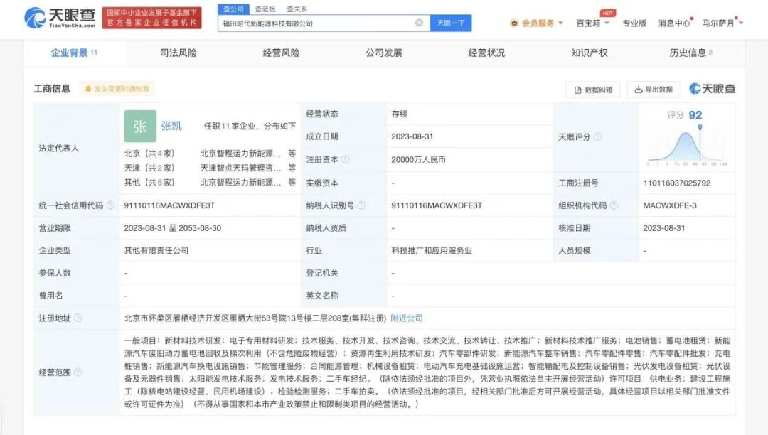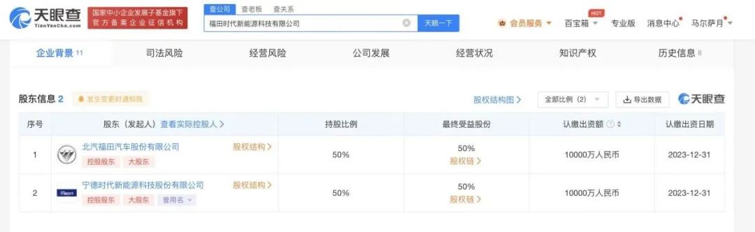 近日,信息显示,福田时代新能源科技有限公司成立,注册资本2亿人民币。股东信息显示,该公司由福田汽车(600166)、宁德时代(300750)共同持股。