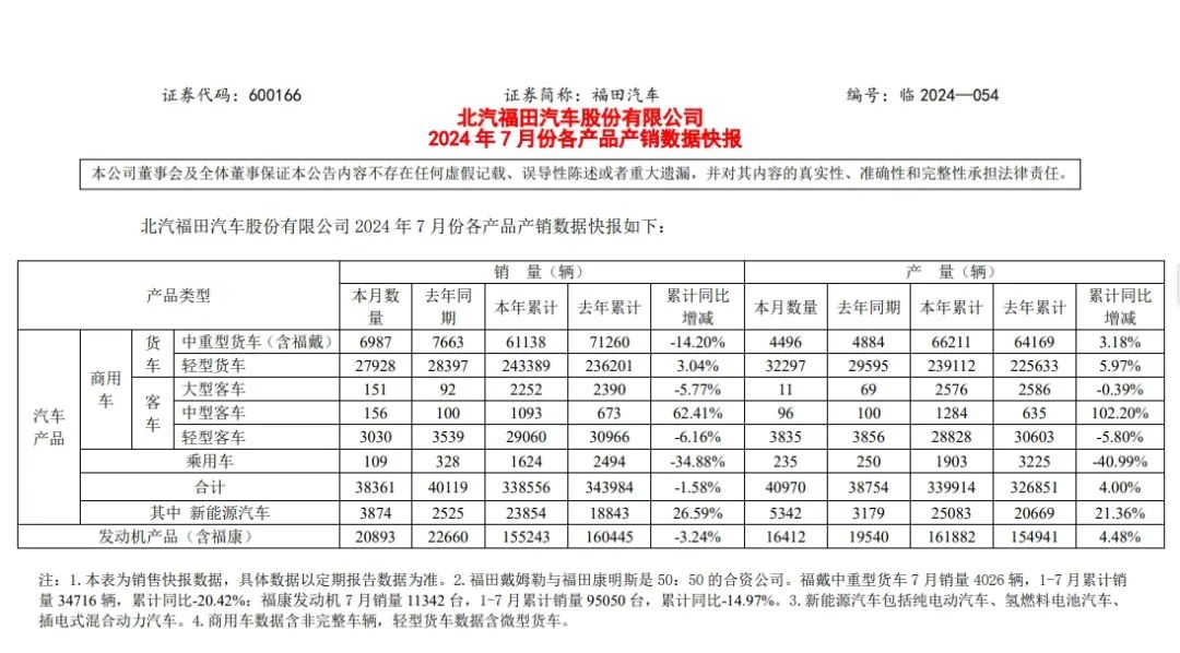 近日,福田汽车(SH600166)发布2024年7月各产品产销数据快报。