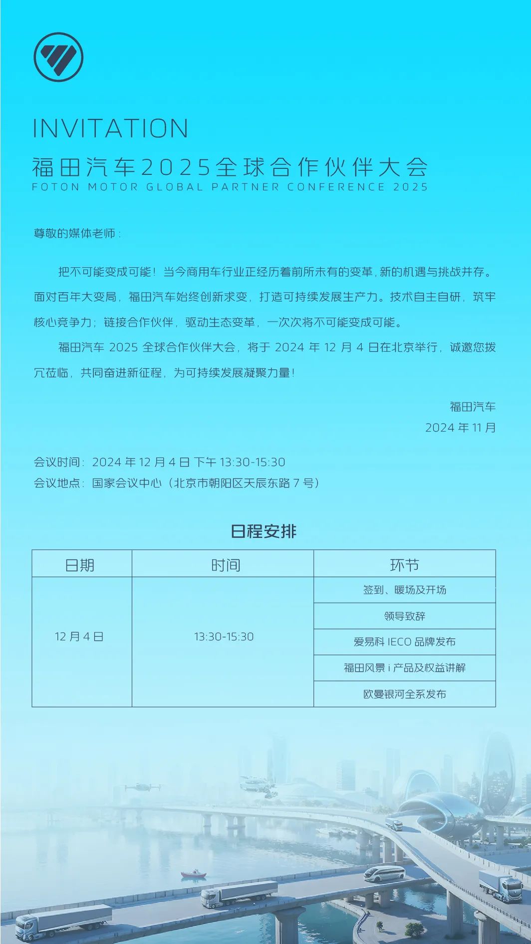2024行将收官,各商用车企业的年会也将召开,日前商用汽车新闻传媒收到福田汽车2025全球合作伙伴大会的邀请函,着实震惊,只因开头第一句话:把不可能变成可能!