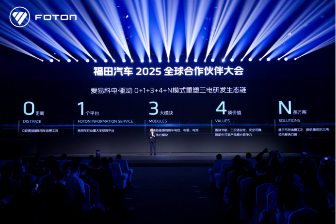 爱易科“电·驱动”通过“0+1+3+4+N”模式重塑三电研发生态链。其中,“0”代表始终坚持用户至上的核心理念,0距离接触商用车使用工况,深入了解一手数据;“1”是指福田大数据平台,是目前商用车行业先进的车联网数据平台,是设计开发核心数据来源的基础;“3”指代电池、电控、电驱三大模块,构成了完整的爱易科“电·驱动”系统;“4”则对应着节能、安全、工况适应性和智能化四大价值维度;而“N”则代表了对未来的无限想象与可能性,预示着多元化的产品解决方案。