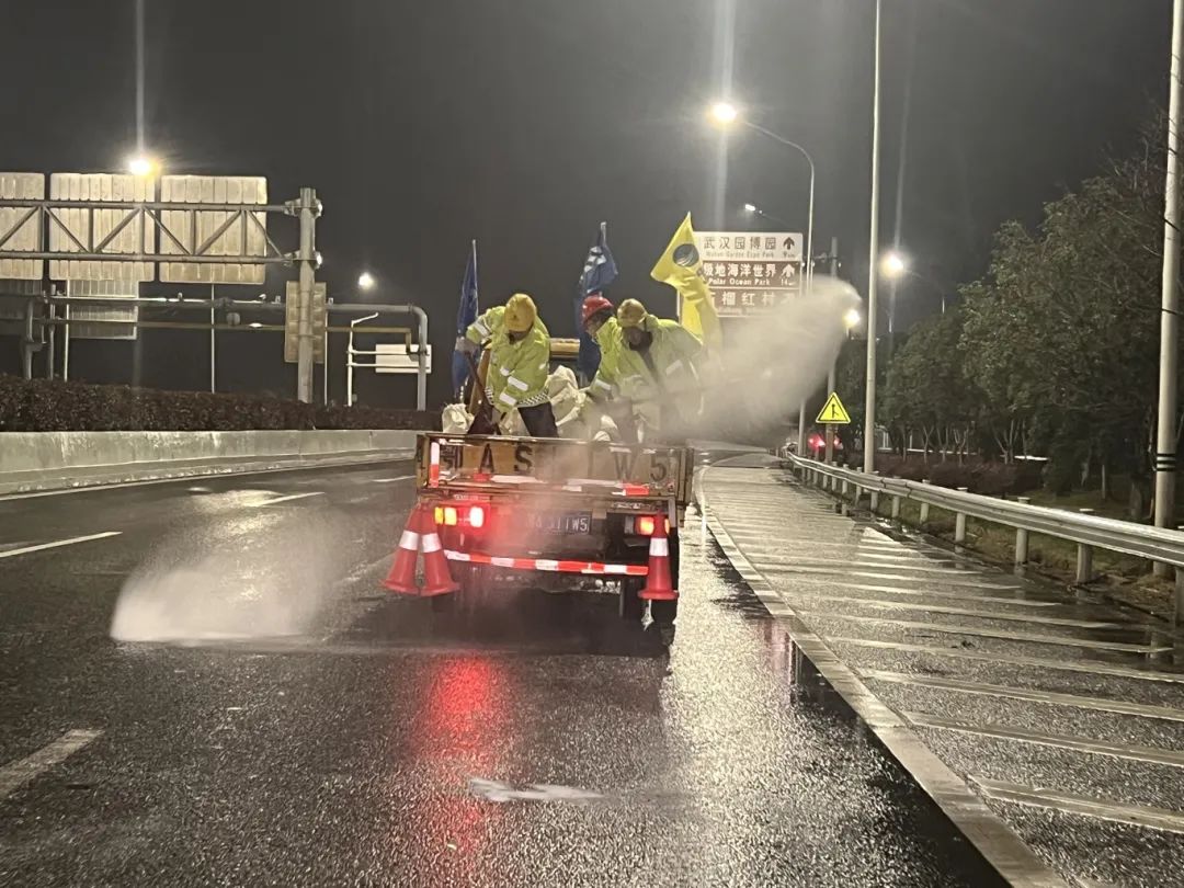 该公司坚守“以雪为令,雪停路清”的信念,开展破冰除雪工作,于2月20日晚组织应急抢险队对硚孝高速匝道至长丰桥汉口段开展融冰作业。公司领导班子现场统筹调度,抢险突击队主力全上,分片包保,盯控结冰道路,以“边下边清、整夜巡回”的方式,对该路段进行地毯式撒布融雪剂作业。