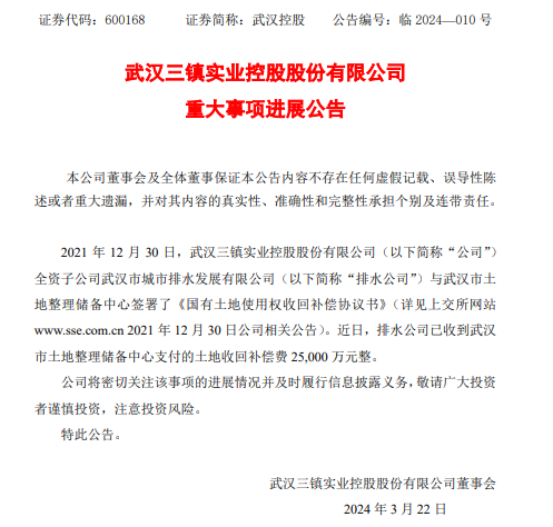 3月22日,武汉三镇实业控股股份有限公司(以下简称“武汉控股”)发布重大事项进展公告。