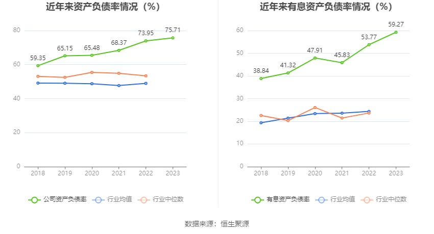 在偿债能力方面,公司2023年年末资产负债率为75.71%,相比上年末上升1.76个百分点;有息资产负债率为59.27%,相比上年末上升5.50个百分点。