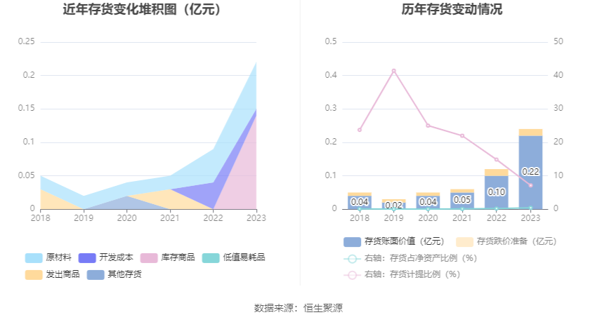 从存货变动来看,截至2023年年末,公司存货账面价值为2199.33万元,占净资产的0.42%,较上年末增加1233.39万元。其中,存货跌价准备为168.77万元,计提比例为7.13%。