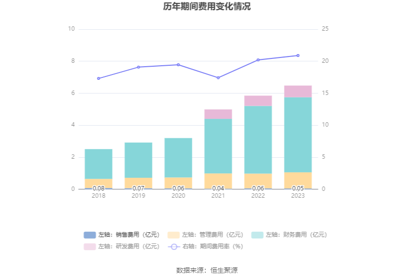 2023年,公司期间费用为6.48亿元,较上年同期增加6365.02万元;期间费用率为20.89%,较上年同期上升0.69个百分点。其中,销售费用同比下降19.46%,管理费用同比增长10.26%,研发费用同比增长14.85%,财务费用同比增长10.85%。