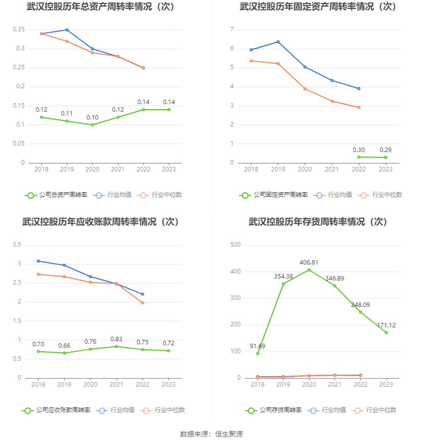 营运能力方面,2023年,公司公司总资产周转率为0.14次,上年同期为0.14次(2022年行业平均值为0.25次,公司位居同行业45/53);固定资产周转率为0.29次,上年同期为0.30次(2022年行业平均值为3.91次,公司位居同行业50/53);公司应收账款周转率、存货周转率分别为0.72次、171.12次。