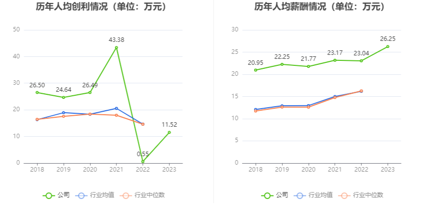 截至2023年末,公司员工总数为1256人,人均创收247.09万元,人均创利11.52万元,人均薪酬26.25万元,较上年同期分别增长11.17%、1982.21%、13.94%。