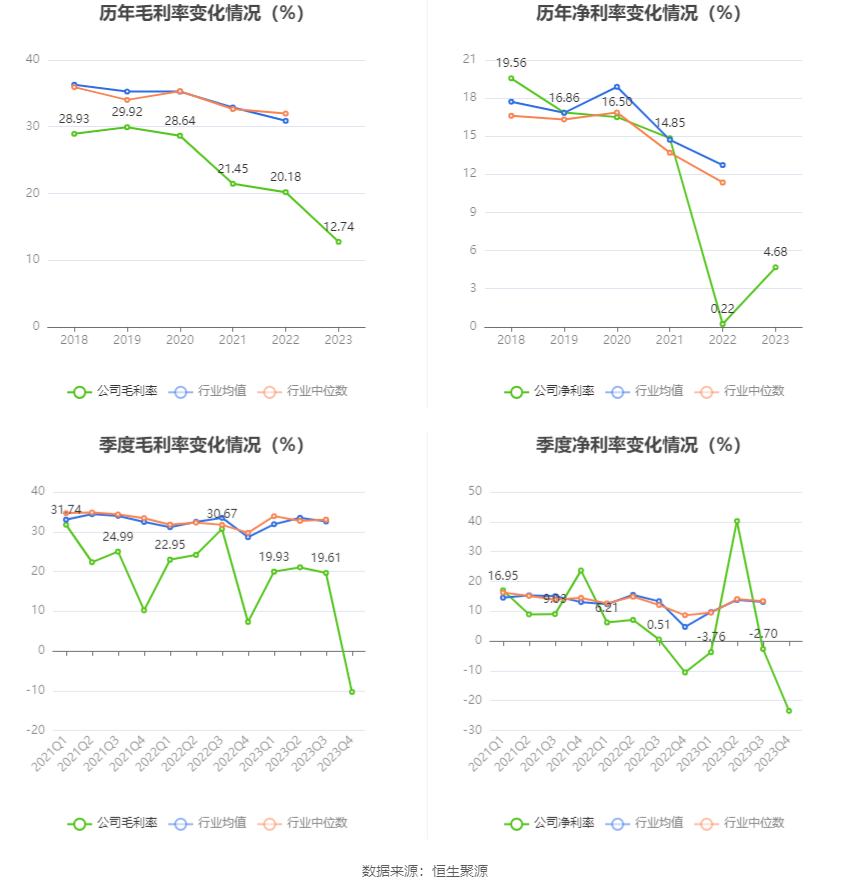 2023年,公司毛利率为12.74%,同比下降7.44个百分点;净利率为4.68%,较上年同期上升4.46个百分点。从单季度指标来看,2023年第四季度公司毛利率为-10.34%,同比下降17.64个百分点,环比下降29.95个百分点;净利率为-23.42%,较上年同期下降12.89个百分点,较上一季度下降20.72个百分点。