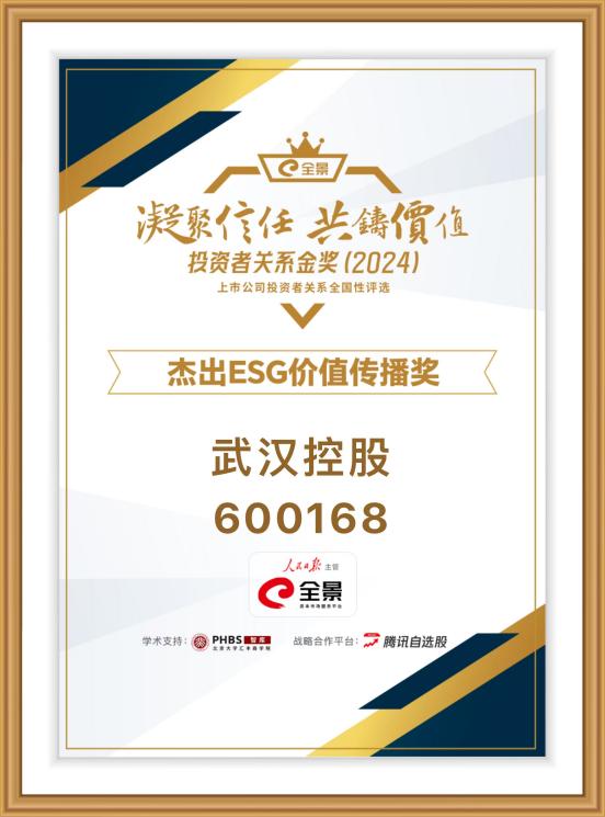 日前,在2025年第六届全景网"凝聚信任共铸价值"上市公司投资者关系全国性评选活动中,武汉控股荣获"杰出ESG价值传播奖"。"全景ESG价值传播奖"由全景网发起,经由沪深北交易所、投服中心、机构高校等专家评审,聚焦上市公司ESG信披深度及其对于利益相关者,尤其是投资者维度的传播效果。该奖项旨在提供深入的ESG评估视角,展示上市公司ESG实践成果,助力投资者做出更明智的投资决策。
