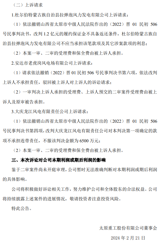 公告指出,近日,原审被告杜尔伯特蒙古族自治县拉弹泡风力发电有限公司、安达市老虎岗风电场有限公司、大庆龙江风电有限责任公司因不服一审判决,向山西省高级人民法院提起上诉。二审案件尚未开庭审理。