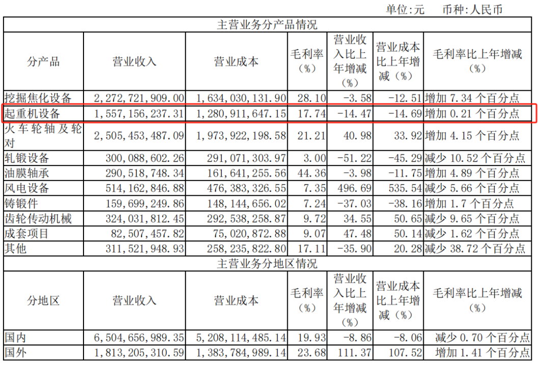 2023年公司主营业务中,起重机设备收入15.57亿元,同比下降14.47%,占营业收入的18.60%。起重机设备2023年毛利率为17.74%。