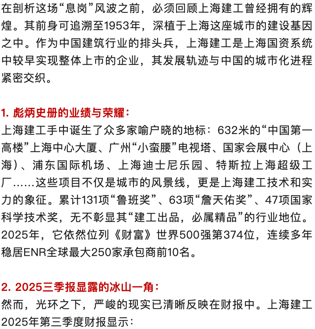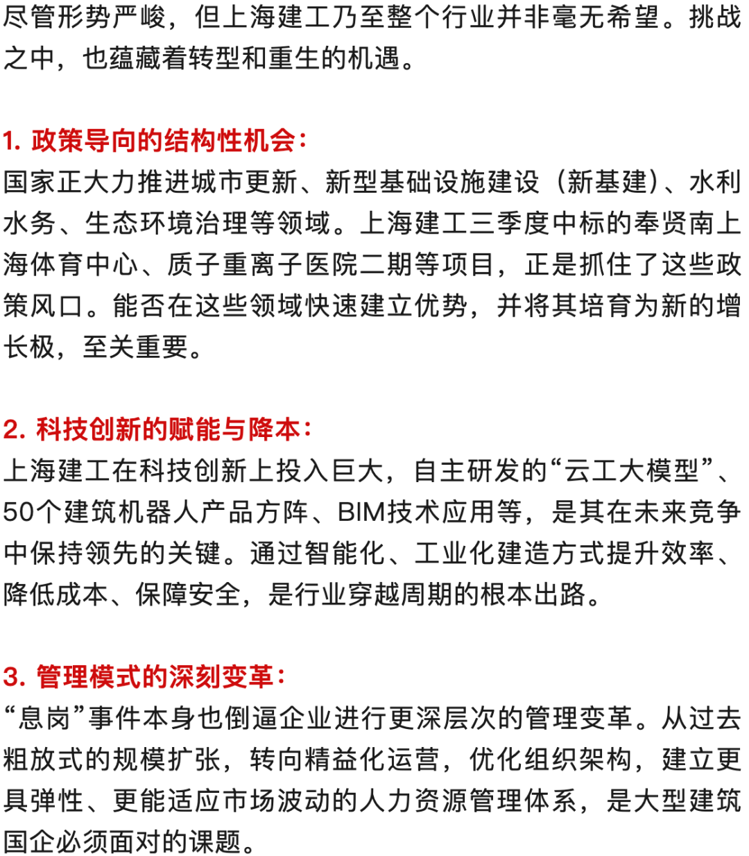 上海建工被誉为“地方施工单位的龙头企业”,背靠上海这一永不缺少建设话题的国际大都市,其资源获取能力和市场底蕴远超绝大多数同行。它的处境说明,行业的困境已非区域性、偶发性问题,而是系统性的、全局性的挑战。当“龙头”都开始为生存而挣扎时,无数中小型建筑企业的境遇可想而知。这不仅是上海建工的危机,更是整个中国建筑业深度调整的缩影。