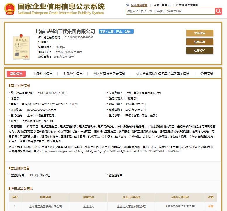 国家企业信用信息公示系统显示,上海市基础工程集团有限公司成立于1993年,法定代表人张思群,注册资本80000万元人民币,由上海建工(600170.SH)全资持股。