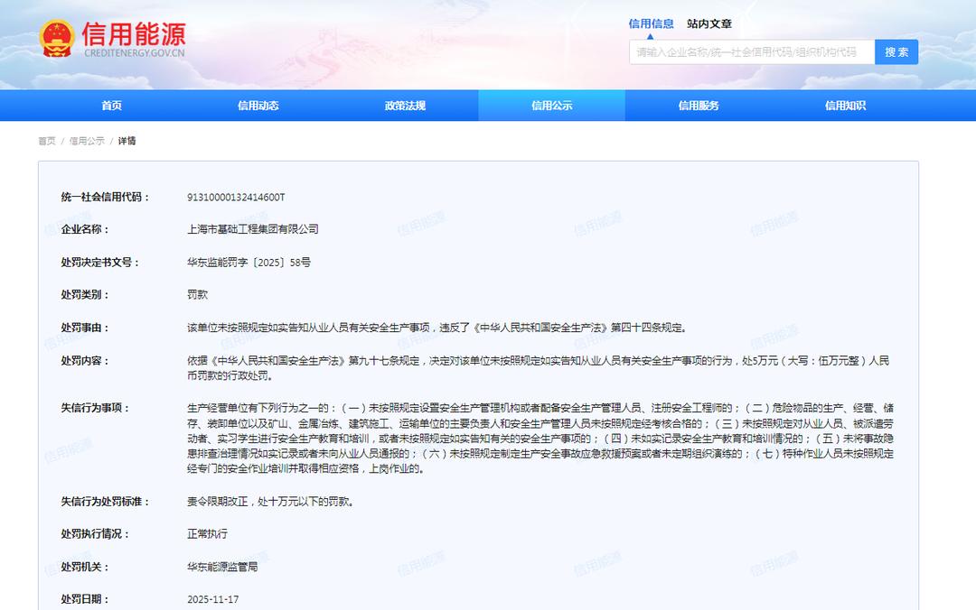 记者于信用能源信用公示栏获悉,11月17日,上海建工(600170.SH)旗下的上海市基础工程集团有限公司(下称“基础集团”)收到罚单,其处罚类别为“罚款”,处罚机关为华东能源监管局。