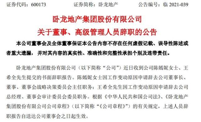 根据公告,因工作变动,陈嫣妮申请辞去卧龙地产董事长、董事、董事会战略决策委员会主任职务;